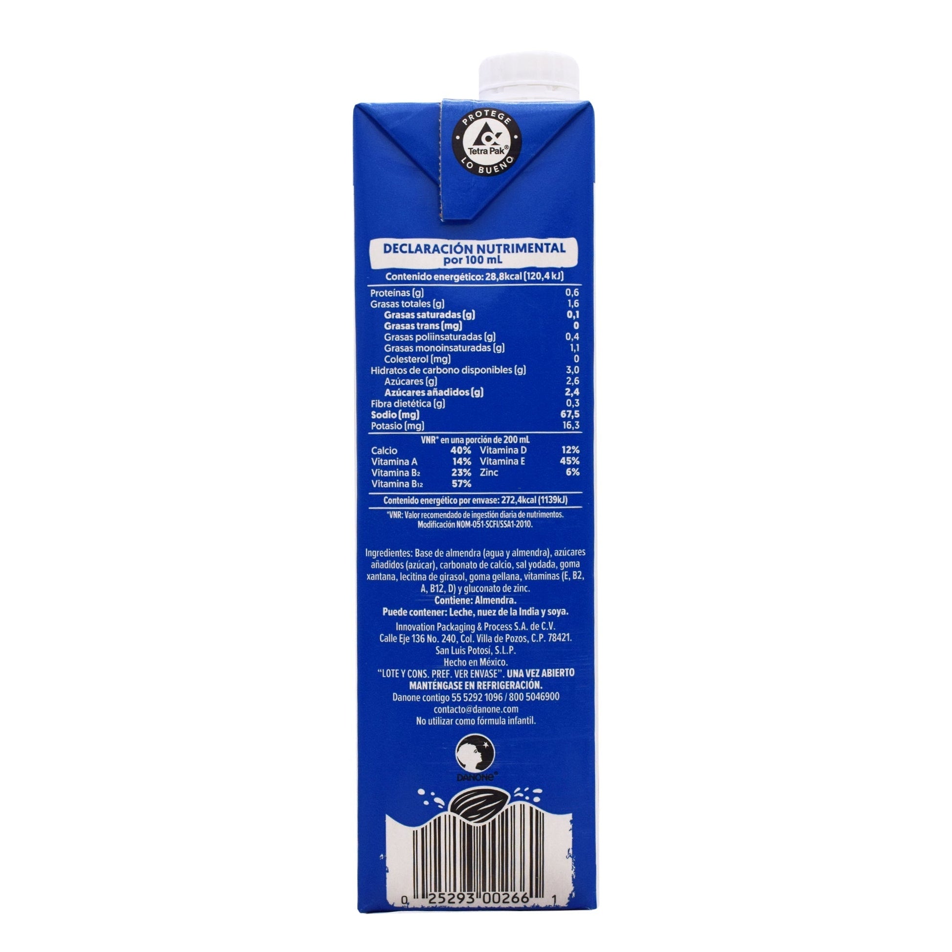 : :Base de almendras (agua y almendra), azíºcares aí±adidos (azíºcar de caí±a y fructosa), carbonato de calcio, sal yodada, algarrobo, lecitina de girasol, goma gellana, vitaminas (E, B2, A, B12, D), gluconato de zinc