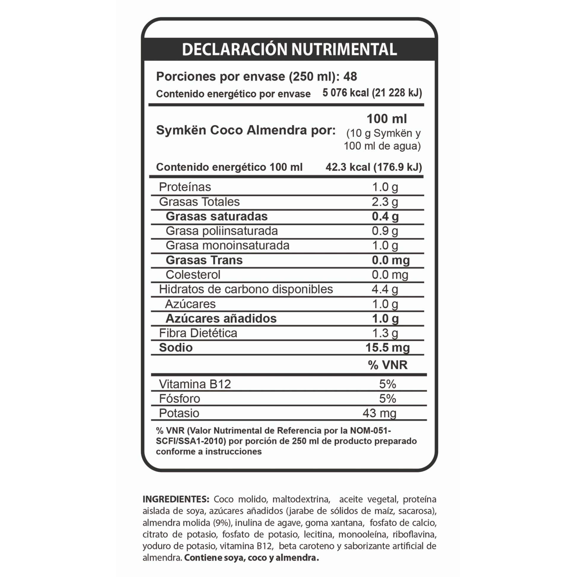 : :Coco molido, maltodextrina, aceite vegetal, proteína aislada de soya, jarabe de sólidos de maíz, sacarosa, almendra molida, inulina de agave, goma xantana, fosfato de calcio, citrato de potasio, fosfato de potasio, lecitina, monooleína, riboflavina, yoduro de potasio, vitamina B12, beta caroteno, saborizante artificial de almendra