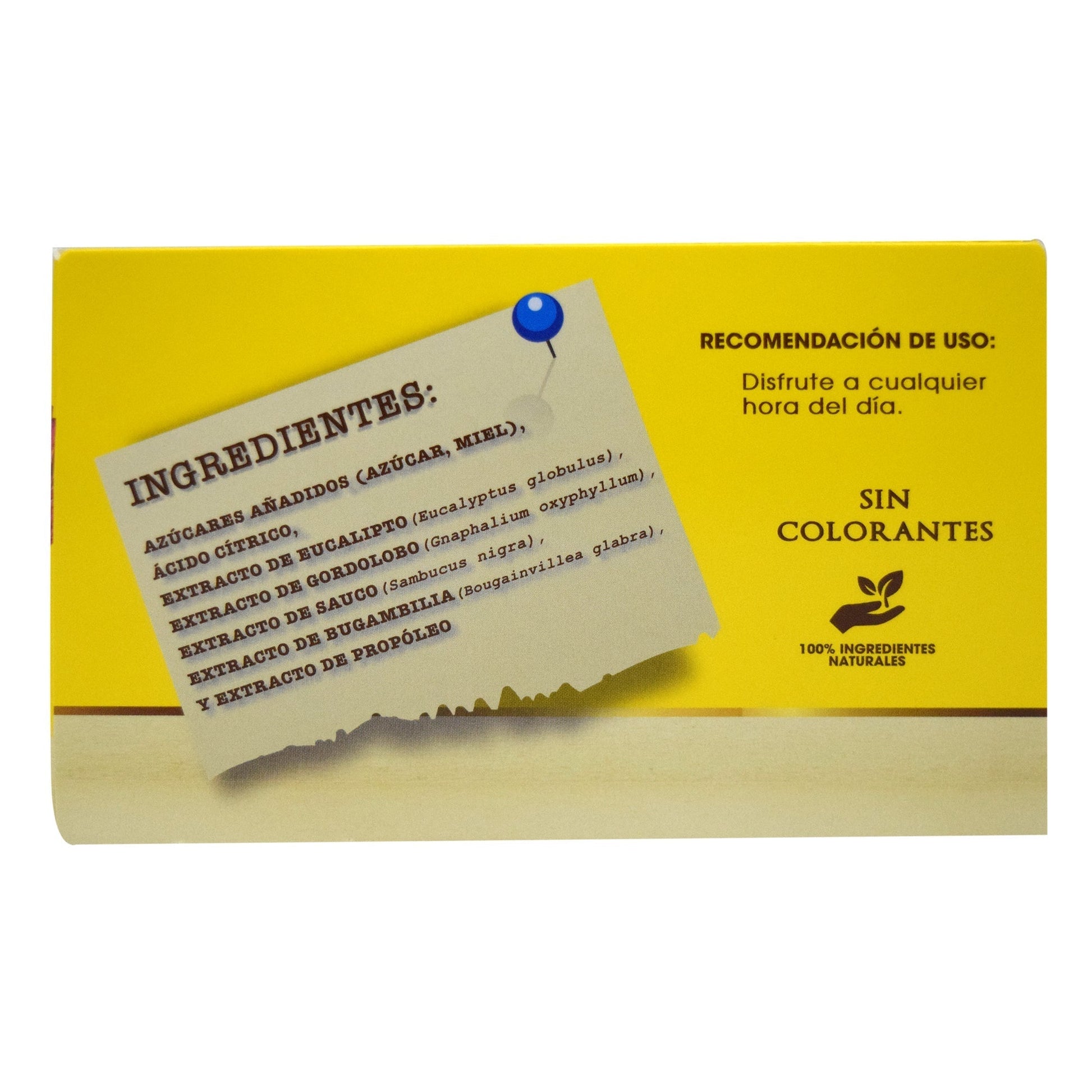 : :Miel de abeja, extracto de eucalipto, gordolobo, sauco, bugambilia, propóleo, ácido cítrico