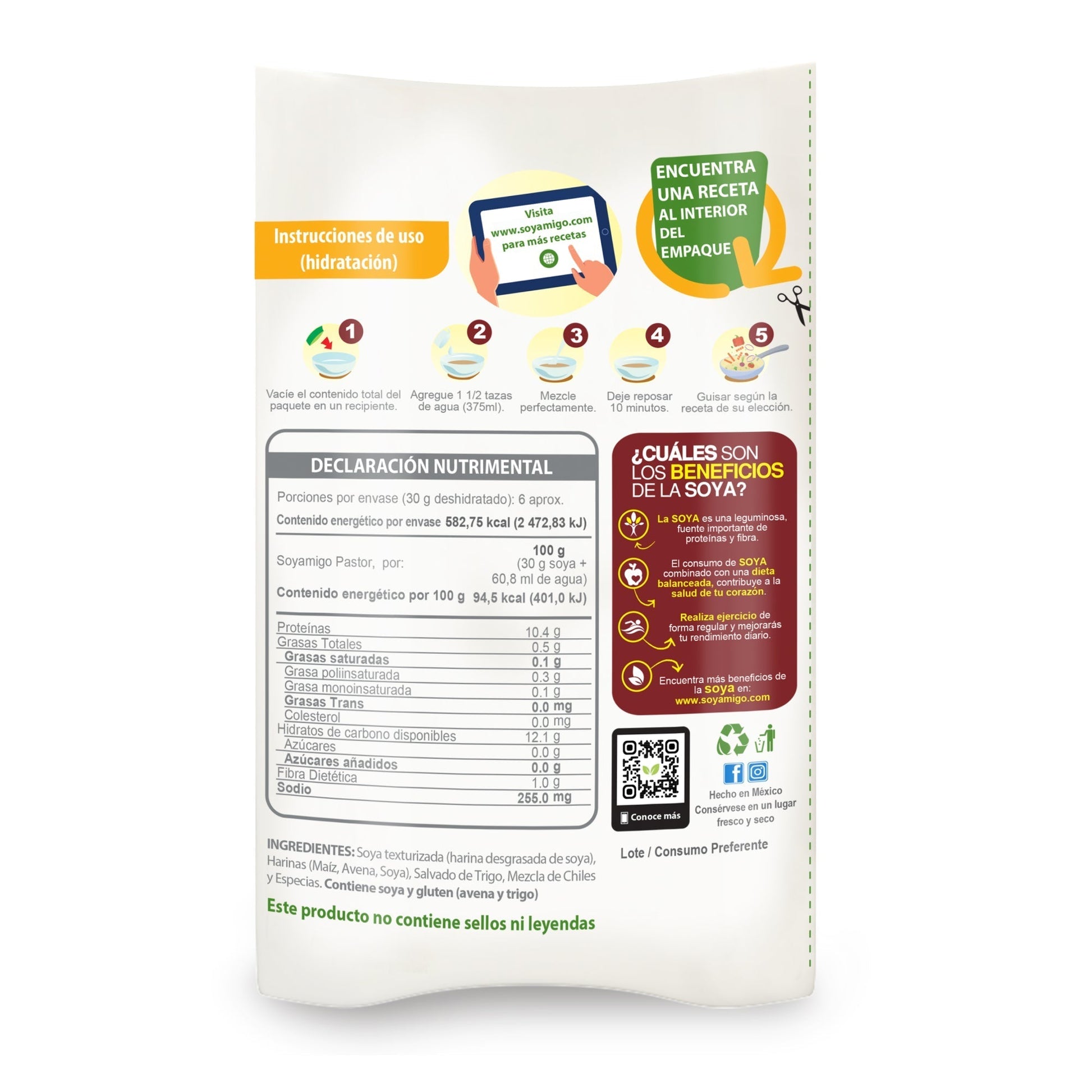 : :Soya texturizada (harina desgrasada de soya), harinas (maíz, avena, soya), salvado de trigo, mezcla de chiles y especias. Contiene soya y gluten (avena y trigo)