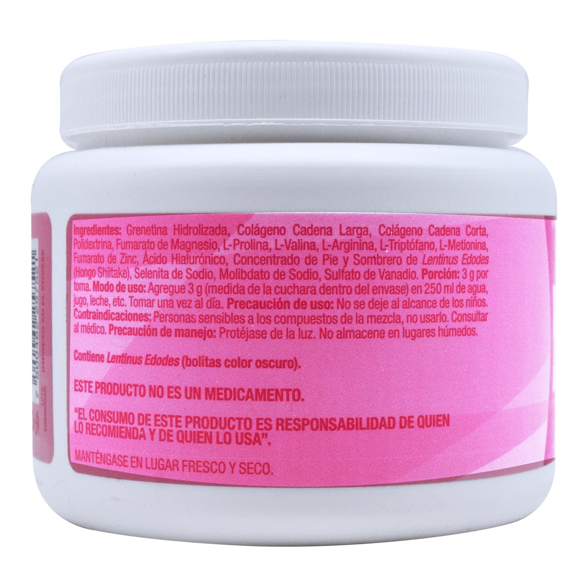 :"PORCION DE 3 GRAMOS EN AYUNAS,MEZCLAR EN AGUA, JUGO, LECHE O LA BEBIDA DE SU PREFERENCIA.