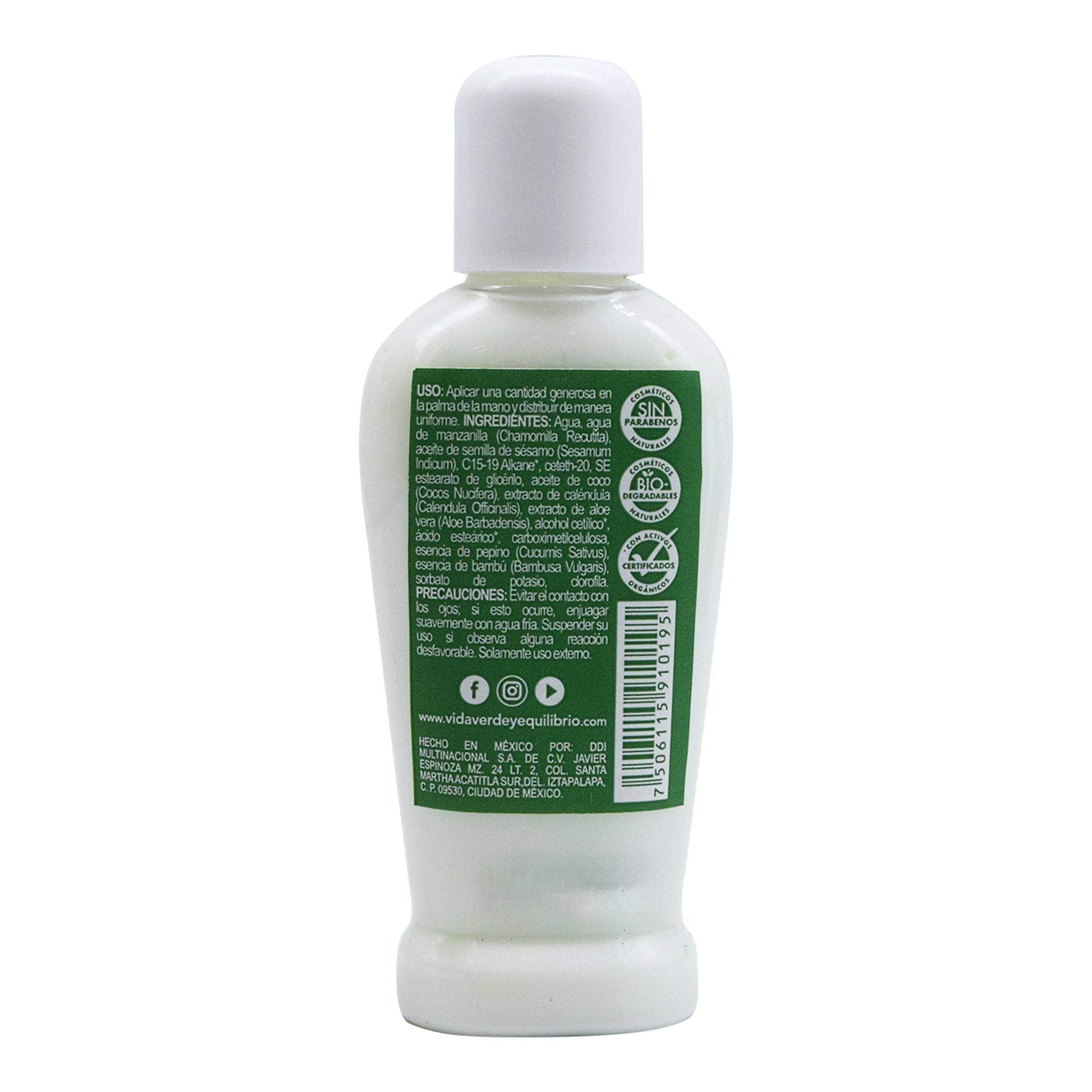 : :Agua, agua de manzanilla, extracto de abeto rojo, aceite de semilla de sésamo, manteca de cacao y coco, gel de aloe vera, extracto de caléndula, palmitato de isopropilo, extracto de pepino, alcohol cetílico, acido esteárico, esencia de bambíº y pepino, sorbato de potasio, clorofila