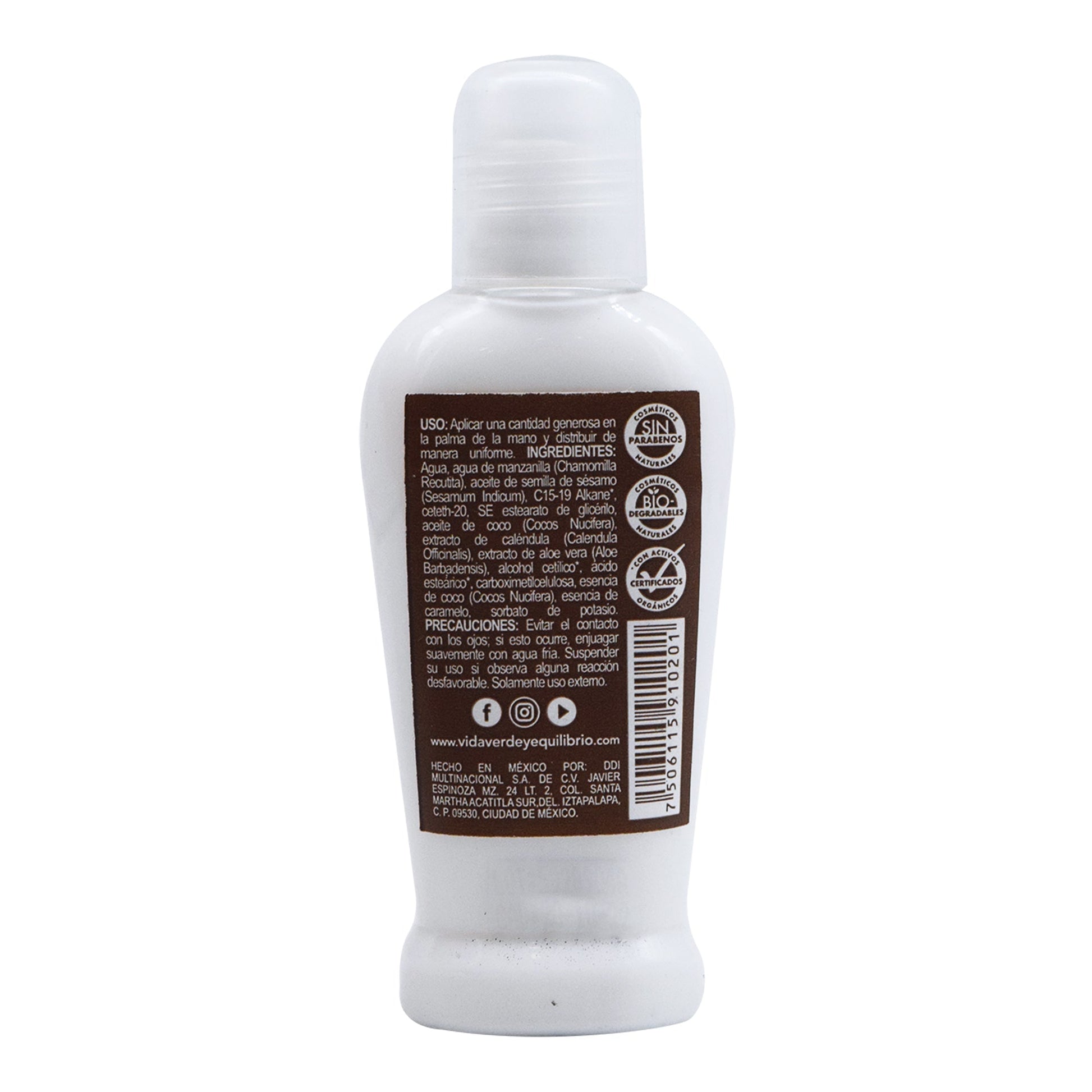 : :Agua, agua de manzanilla, aceite de semilla de sésamo, aceite de coco, extracto de caléndula, extracto de aloe vera, alcohol cetílico, ácido esteárico, carboximetilcelulosa, esencia de coco esencia de caramelo, sorbato de potasio