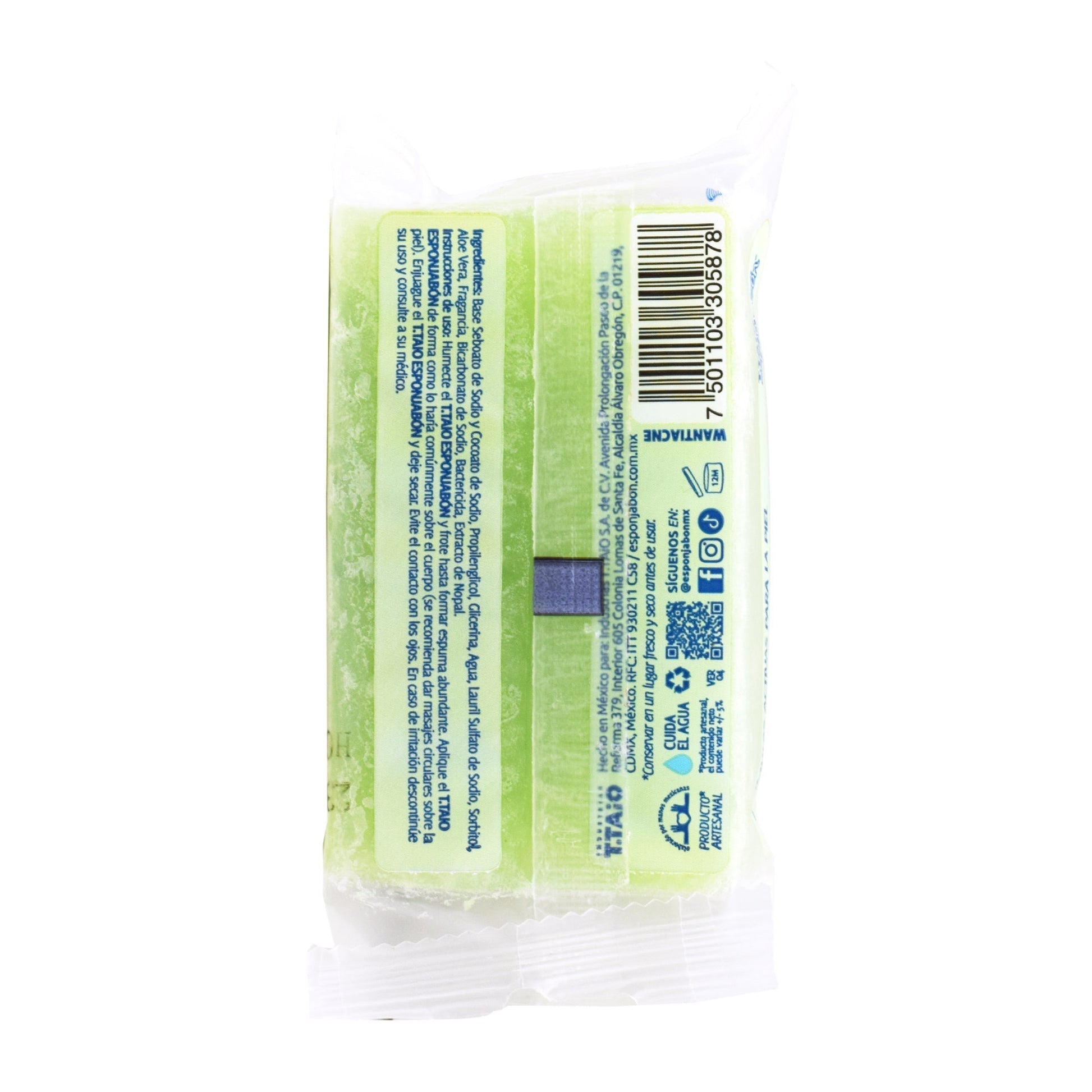 : :Jabón con esponja integrada 2 en 1 formulado con sábila para humectar la piel