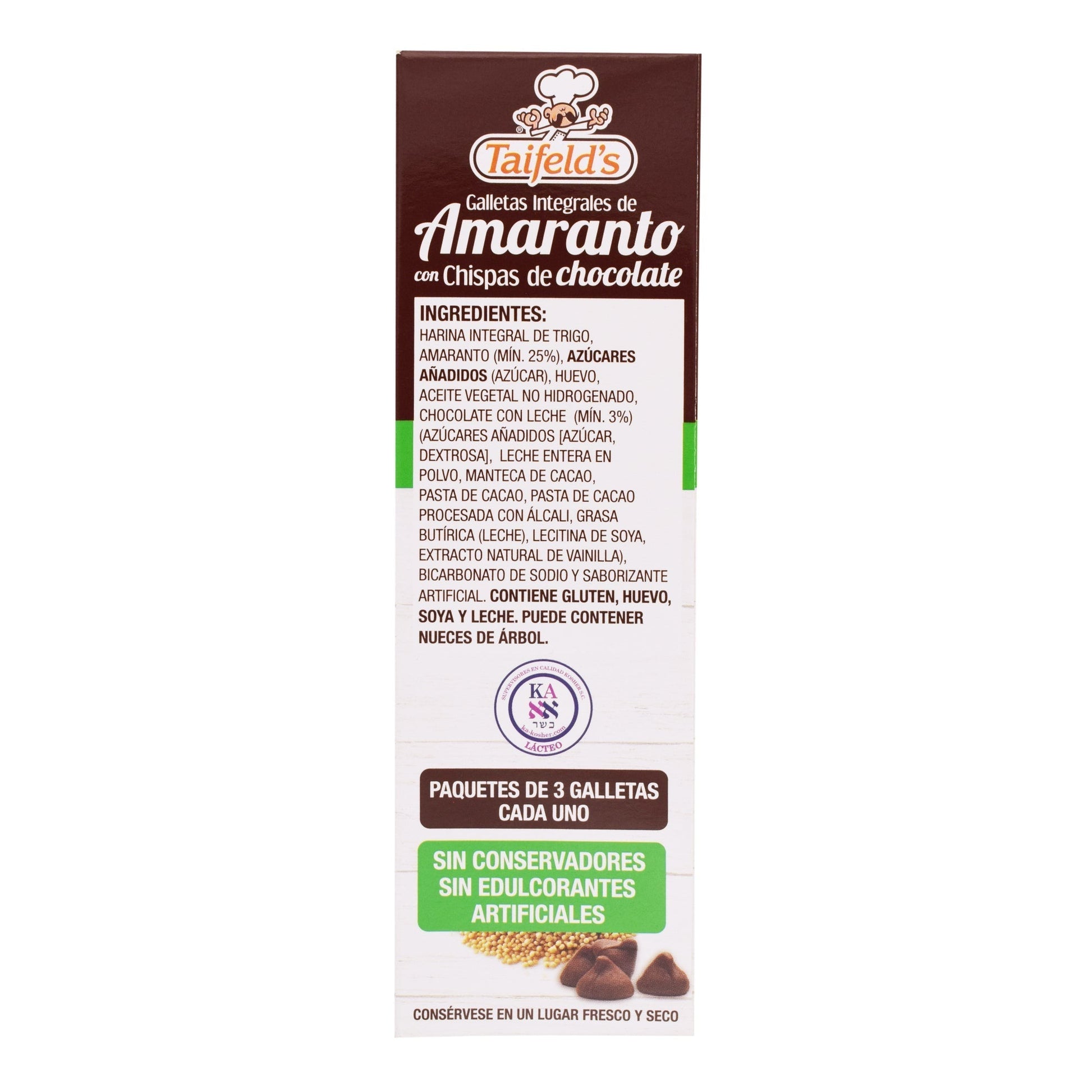 : :Harina integral de trigo, amaranto, azíºcar, huevo, aceite vegetal, chocolate con leche, cacao, extracto natural de vainilla