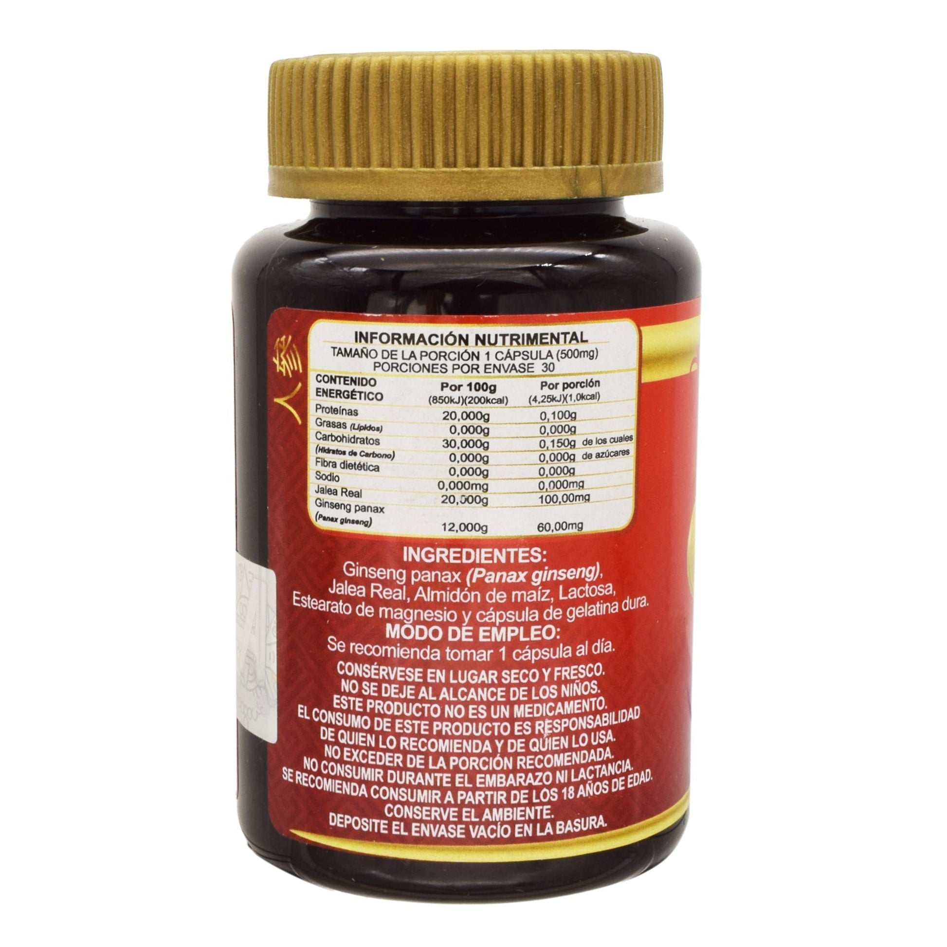 : :Ginseg panax, jalea real, almidón de maíz, lactosa, estearato de magnesio, capsulas de gelatina dura