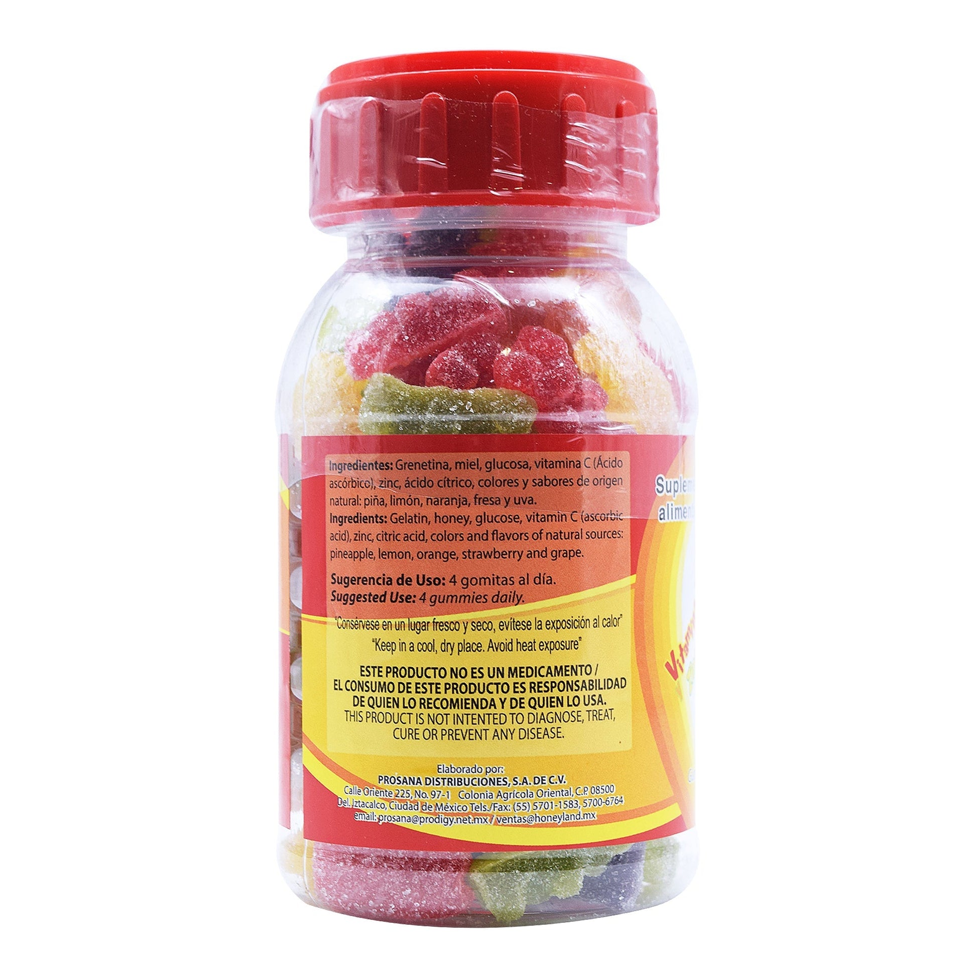 : :Grenetina, miel, glucosa, vitamina C, zinc, ácido cítrico, sabores de origen natural, pií±a, limón, naranja, fresa y uva