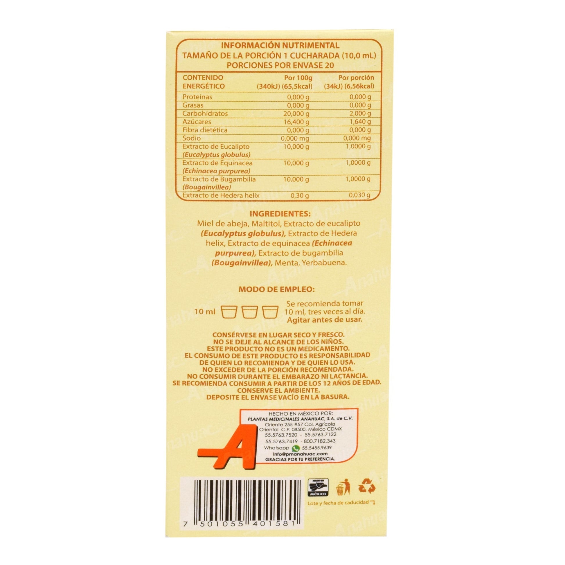 : :Miel de abeja, extracto de eucalipto, extracto de hedera helix, extracto de equinácea y extracto de bugambilia