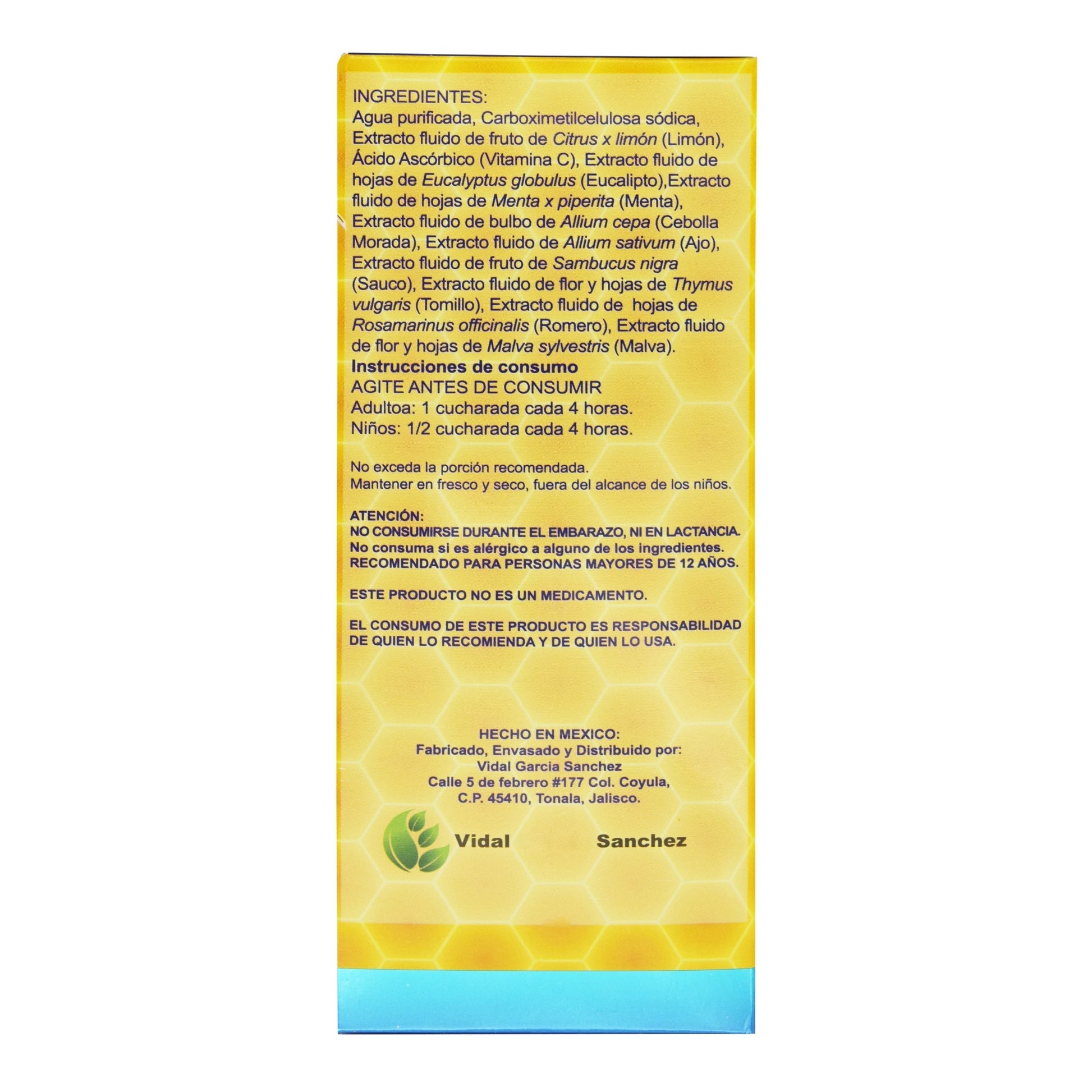 : :Miel de abeja, extracto de flores de gordolobo, cebolla morada, hojas de tomillo, planta de romero, bayas de sauco, bulbo de ajo, jugo de limón