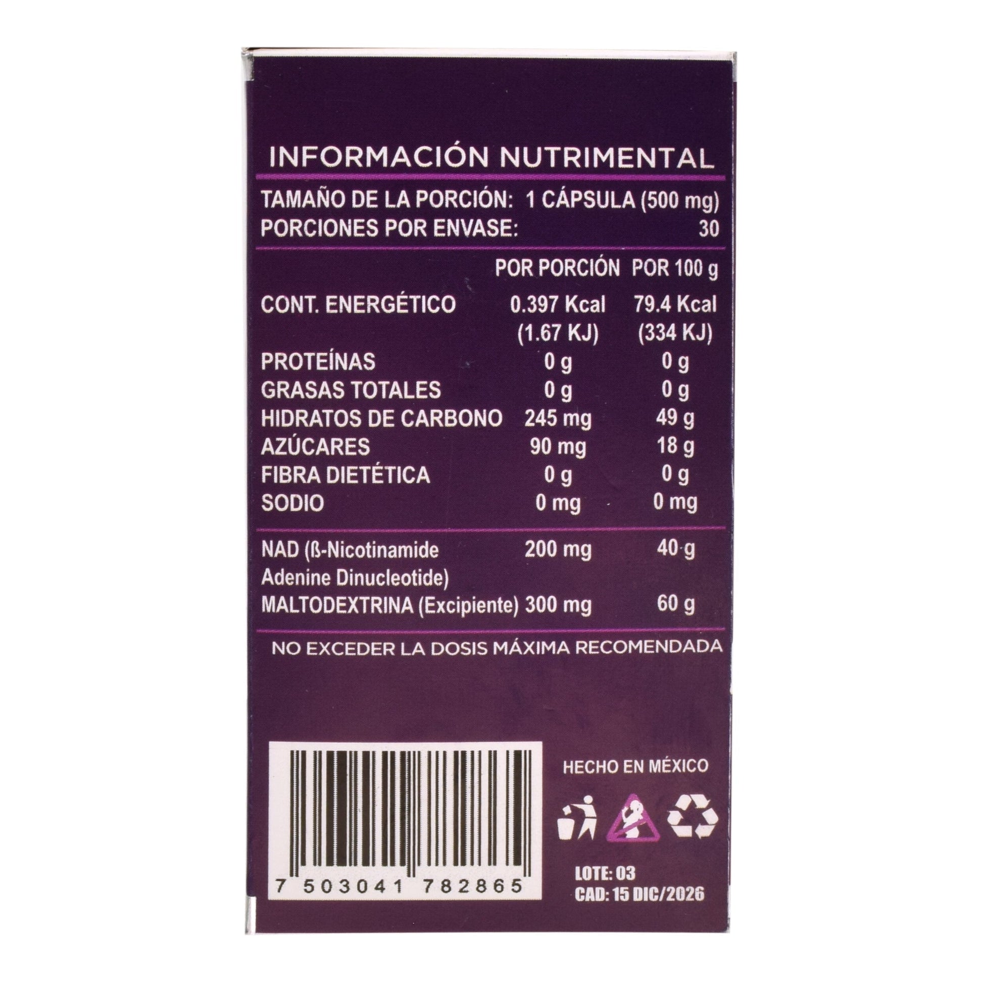 No se deja al alcance de los nií±os, conserve el frasco cerrado en un lugar fresco y seco, no consumir en embarazo ni lactancia