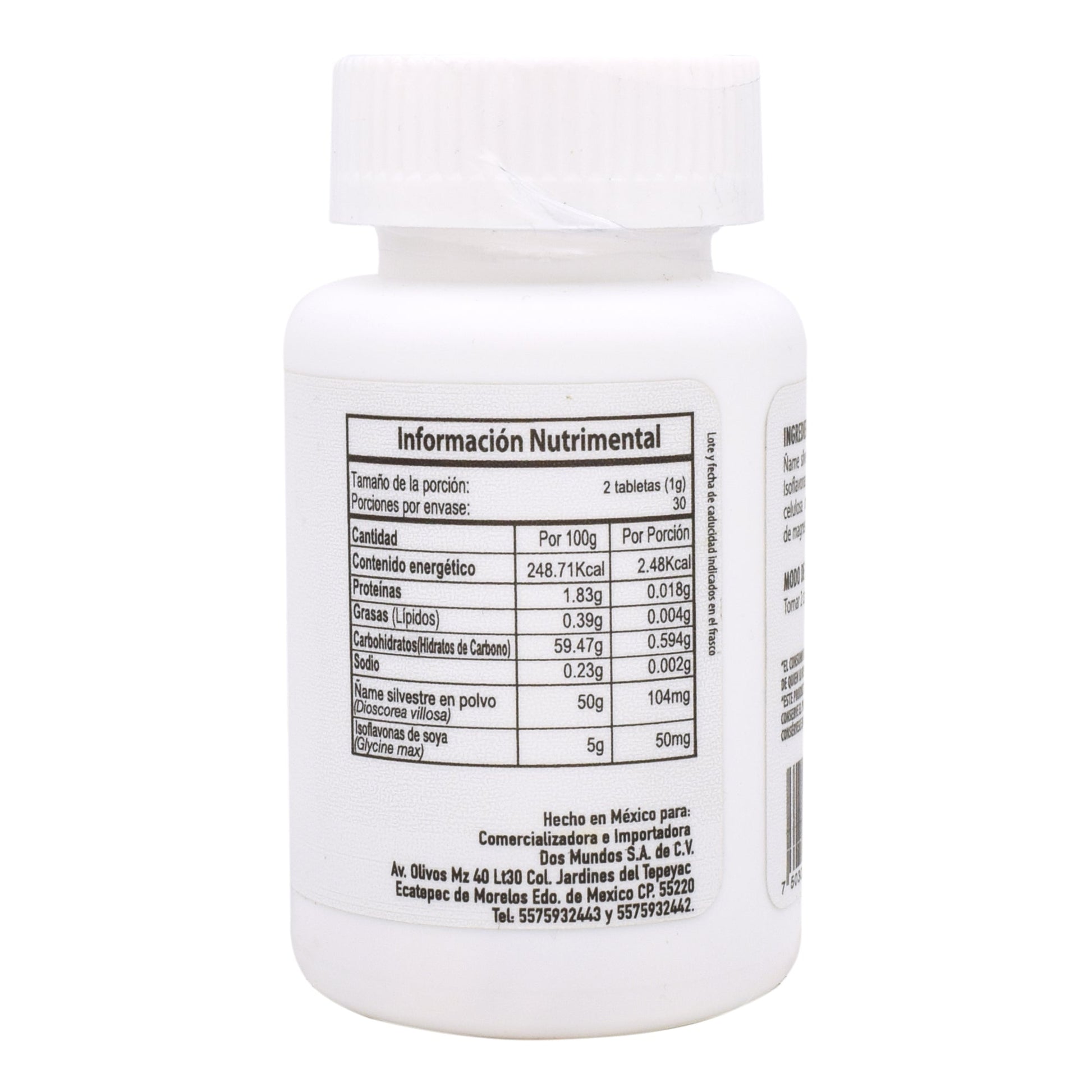 : :퀘ame silvestre (dioscorea villosa), isoflavonas de soya (glycine max), celulosa microcristalina, fosfato dibasico de calcio, dióxido de silicio, estearato de magnesio