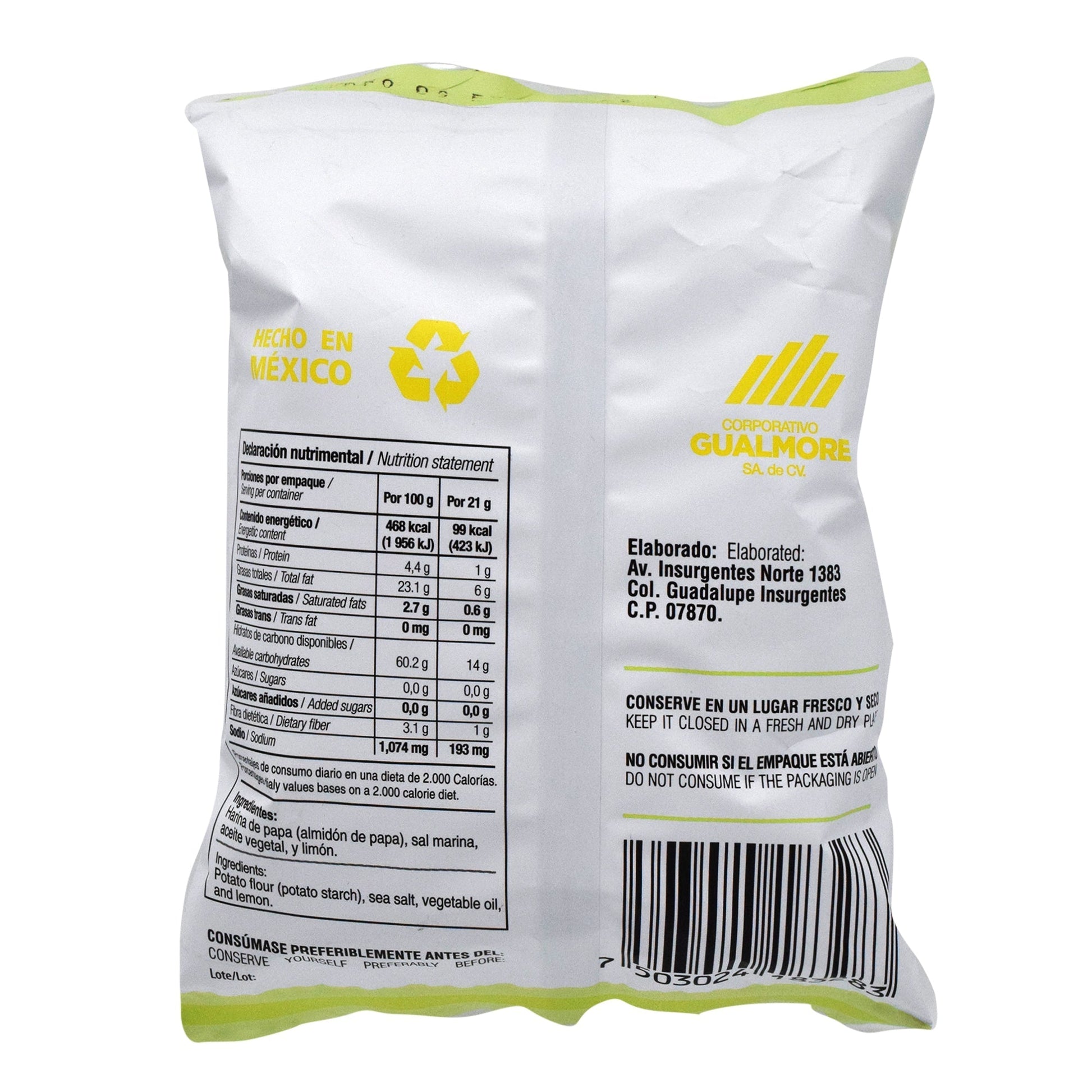: :Harina de papa (almidón de papa), sal marina, limón y aceite vegetal