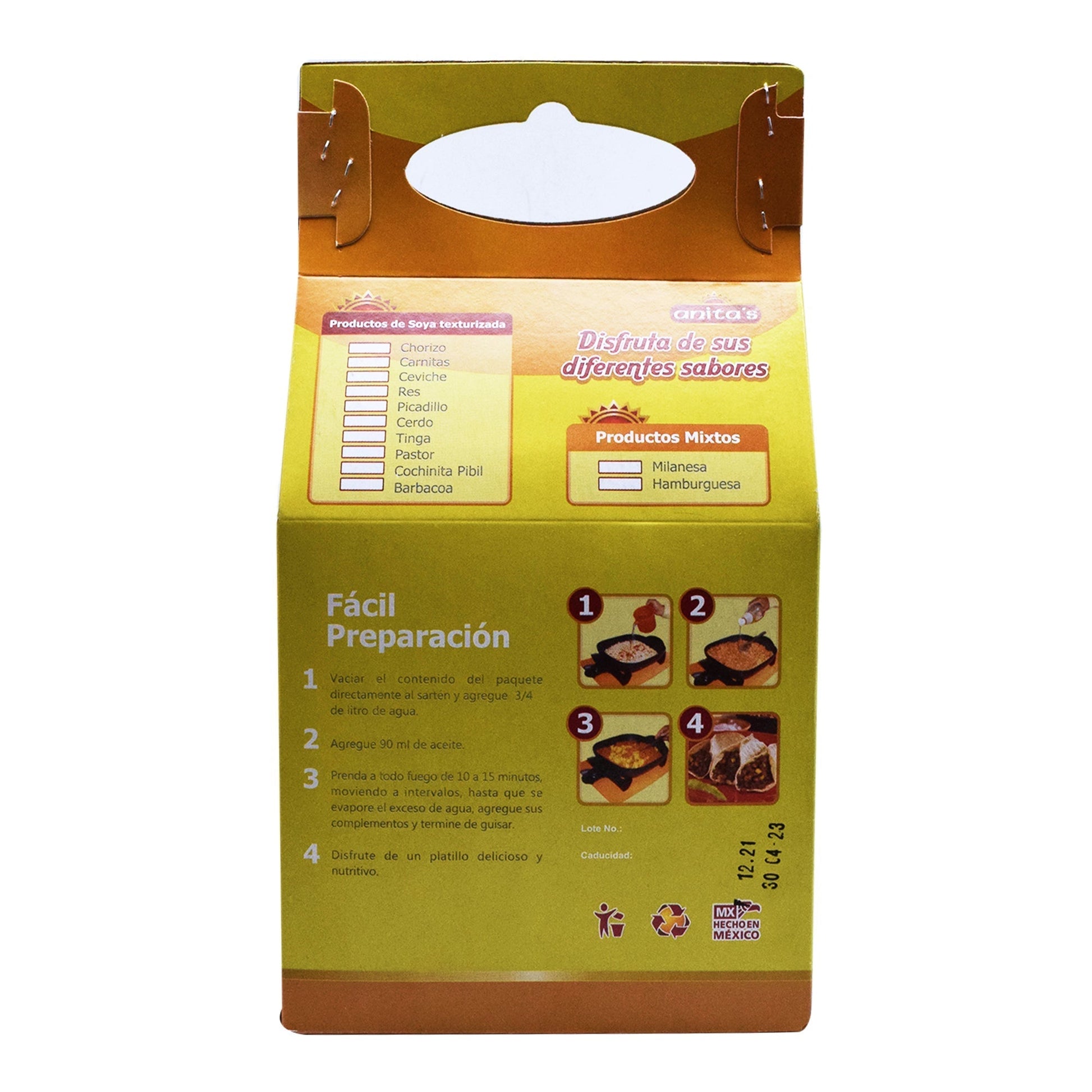 :Vaciar el contenido del empaque directamente en el sartén y agregue ¾ de litro de agua, agregar 90ml de aceite, dejar cocinar de 10 a 15 minutos, moviendo a intervalos, hasta que se evapore el exceso de agua, agregar complementos y guisar