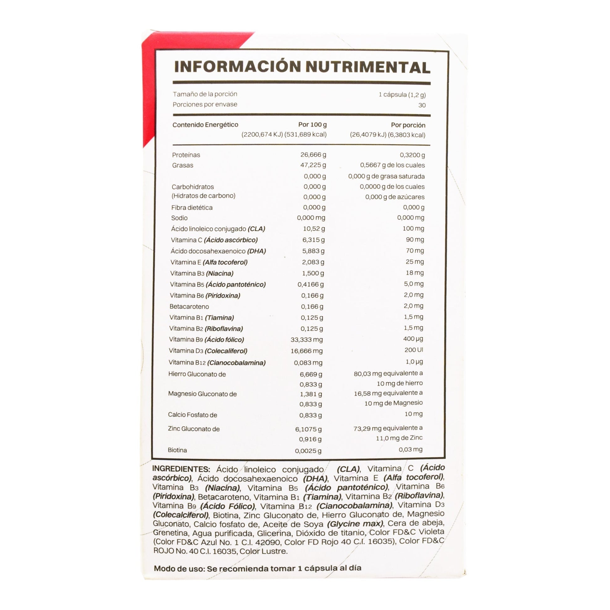 : :í�cido Linoleico Conjudado (CLA), Vitamina C, Dha, Vitaminas E, B3, B5, B6, B1, B2, B9, B12, D3, Betacaroteno