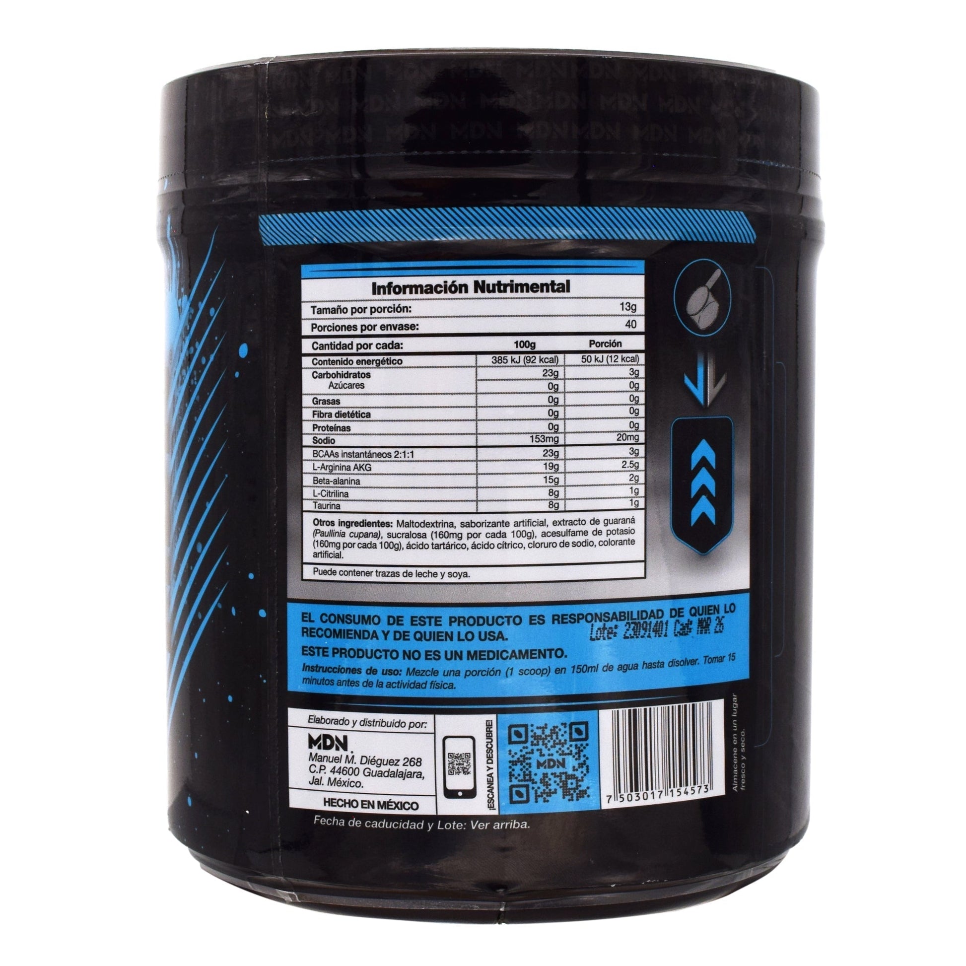 : :Leucina, isoleucina, valina, L-arginina, beta Alanina, L-citrulina, L-taurina, Ornitina AKG, Cafeína Anhidra, ácido Tartárico