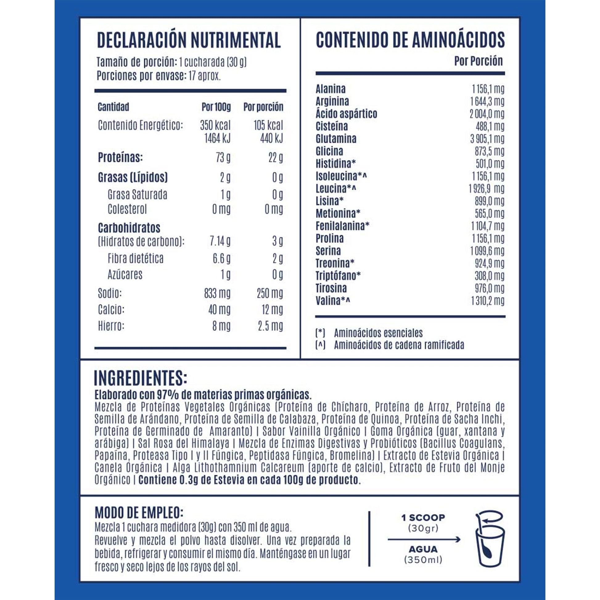 : :Proteína de arroz orgánica, proteína de chícharo, proteína de quínoa, proteína de semilla de calabaza orgánica, proteína de semilla de lupino, proteína de sacha inchi, proteína de semilla de girasol, amaranto orgánico, creatina