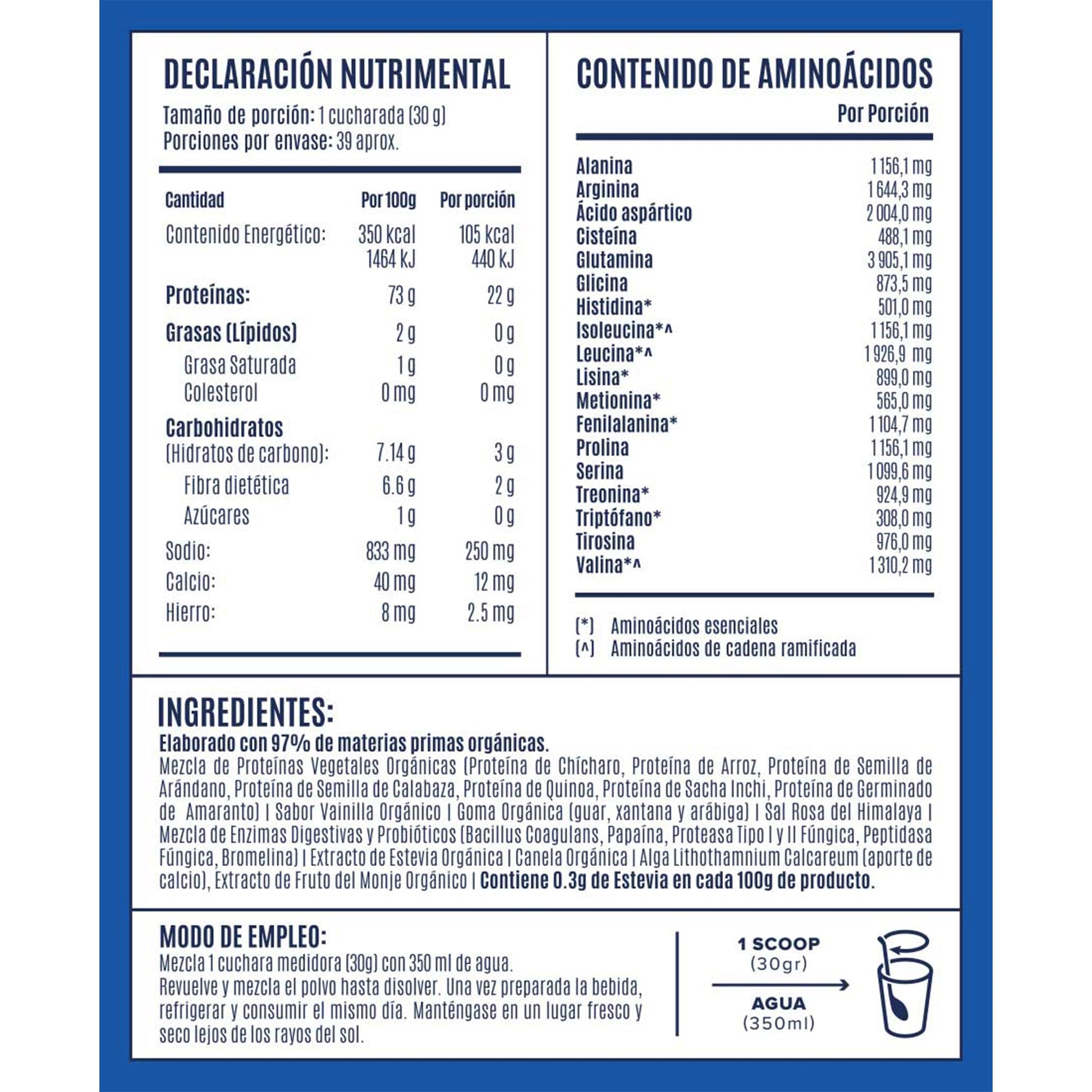 : :Proteína de arroz orgánica, proteína de chícharo, proteína de quínoa, proteína de semilla de calabaza orgánica, proteína de semilla de lupino, proteína de sacha inchi, proteína de semilla de girasol, amaranto orgánico, creatina