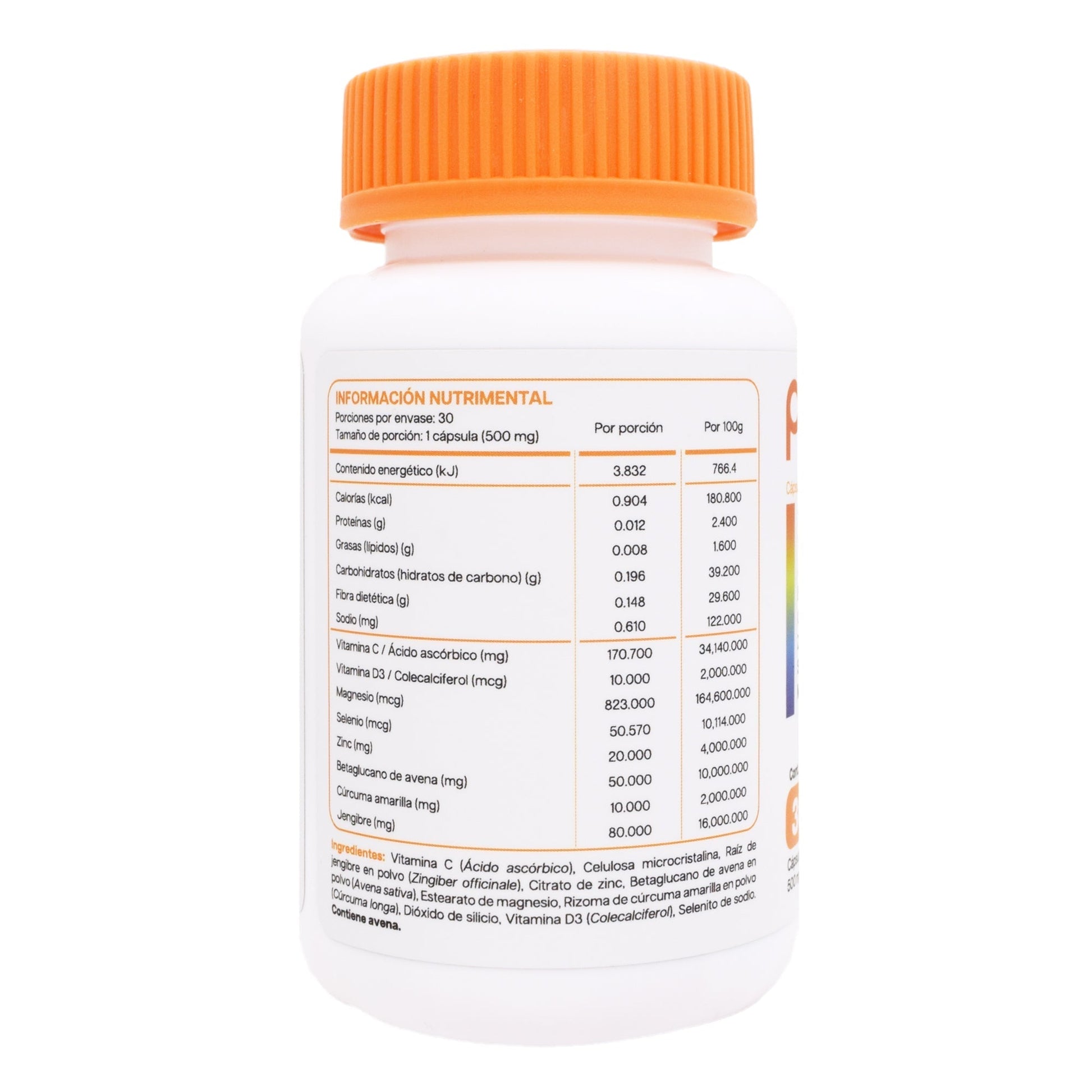 : :Vitamina C, ácido ascórbico, selenio, magnesio, zinc, betaglucano de avena, cíºrcuma amarilla, vitamina D3, colecalciferol, jengibre
