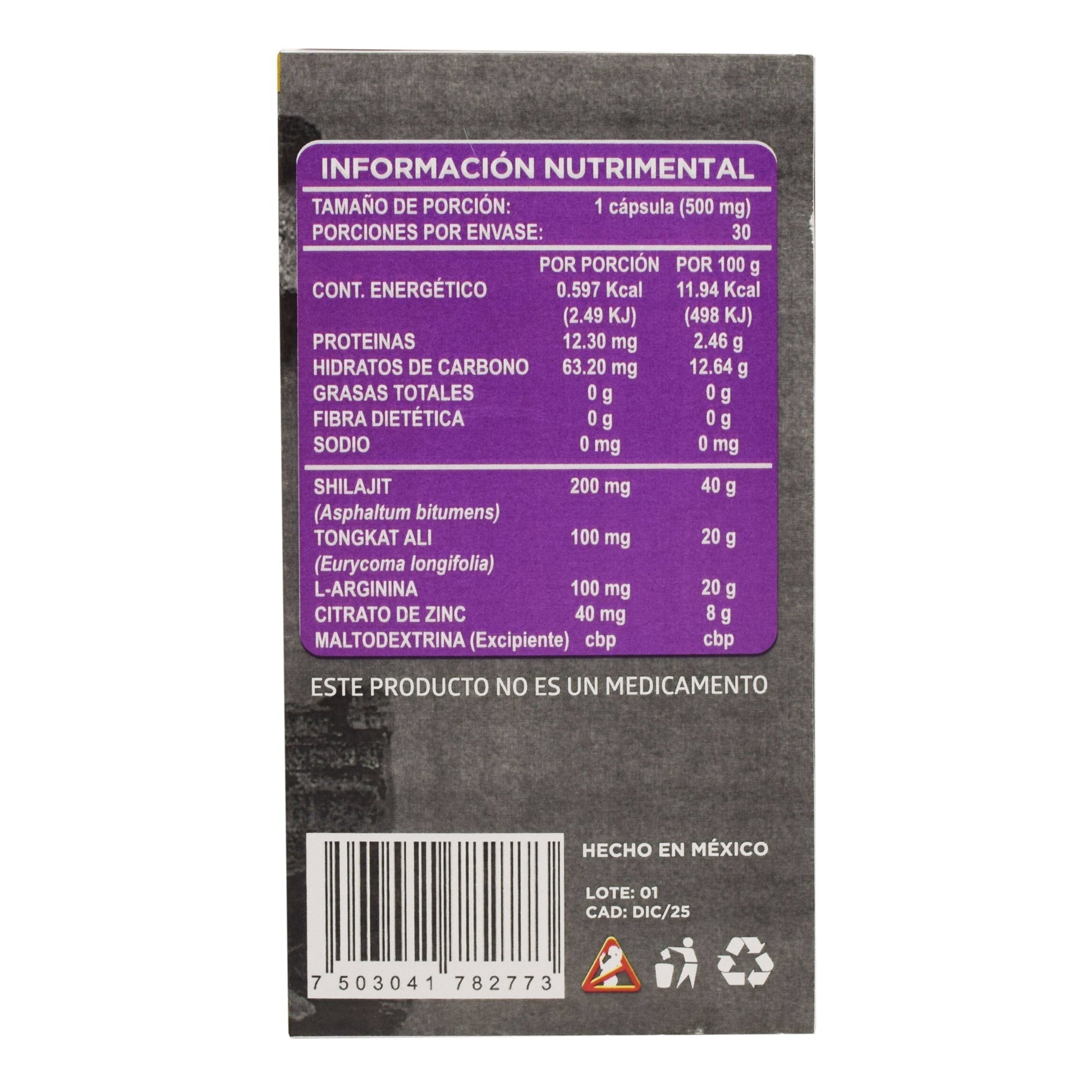 : :Shilajit, tonkat-ali, L-arginina, citrato de zinc, maltodextrina