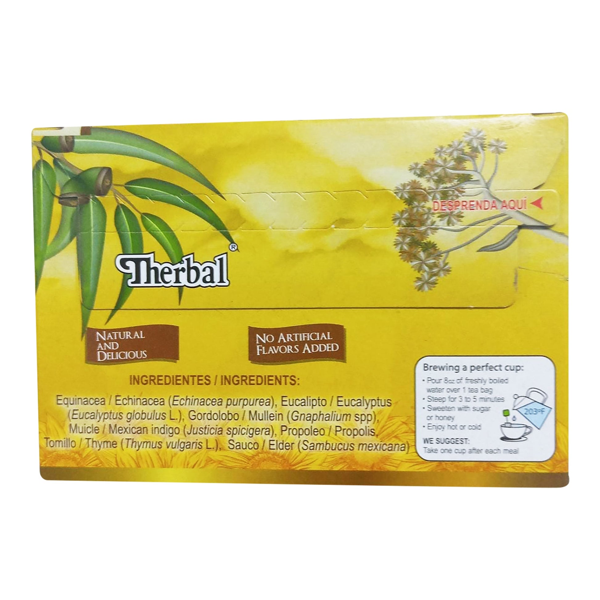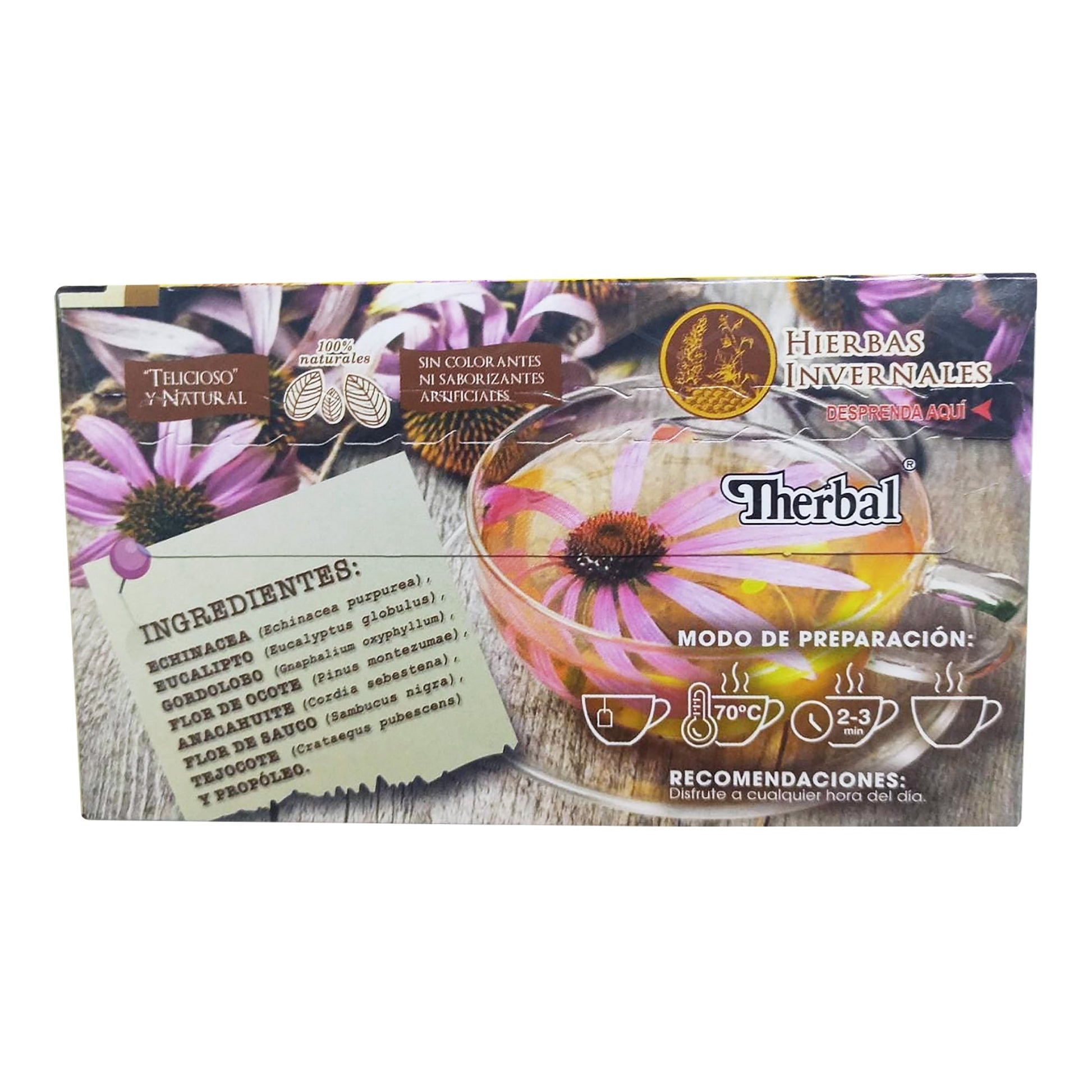 :Equinacea, eucalipto, gordolobo, flor de ocote, anacahuite, flor de sauco, tejocote y propoleo