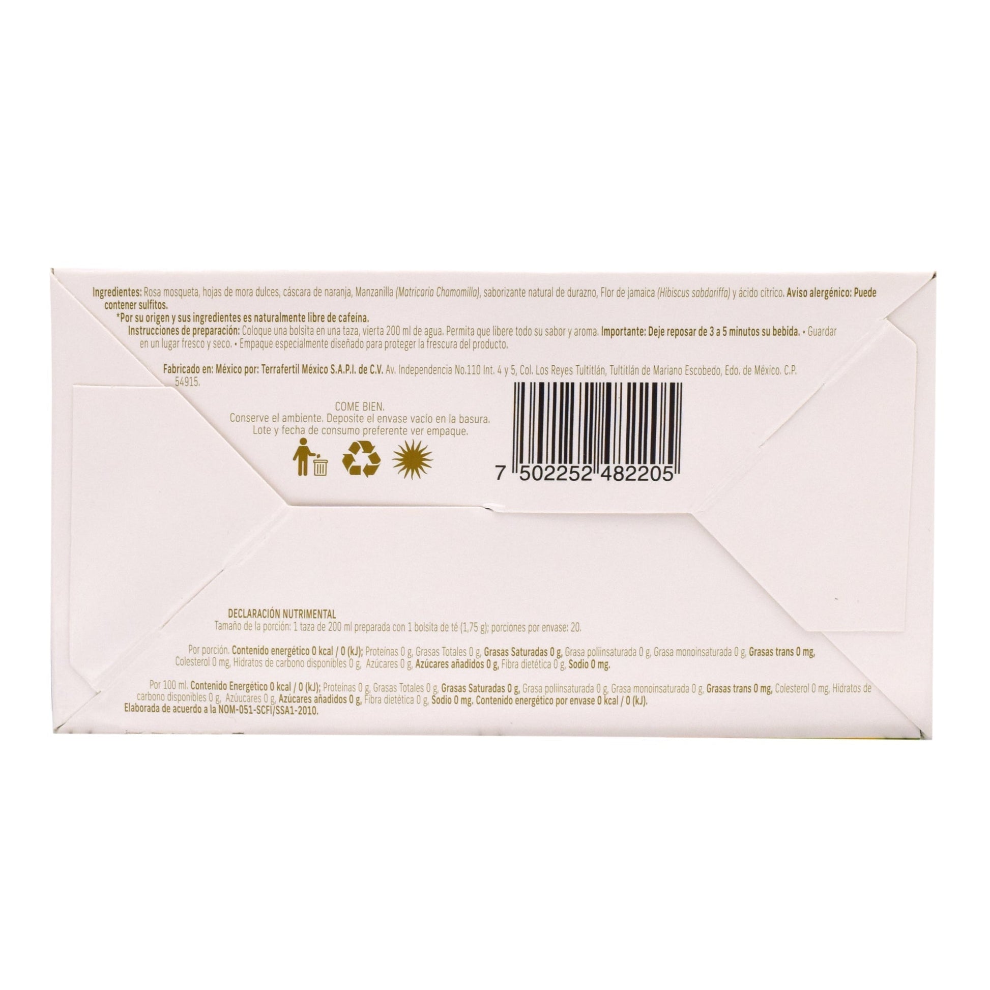 : :Rosa mosqueta, hojas de moras dulces, manzanilla, durazno, flor en Jamaica y ácido cítrico