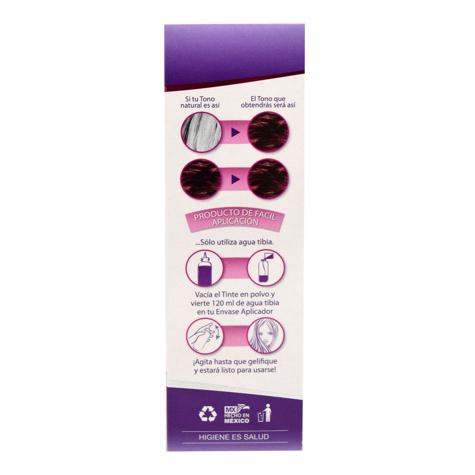:Colocarse los guantes, verter el polvo en la botella aplicadora, verter 120 ml de agua caliente (50°c) hasta la marca, agitar hasta que esté completamente mezclado, comienza la aplicación y deja actuar desde 30 hasta 45 minutos dependiendo la intensidad del tono que quieras, enjuaga y aplica el revitalizador para cabello por un lapso de 3 minutos, enjuaga nuevamente con agua tibia y seca, desecha el sobrante