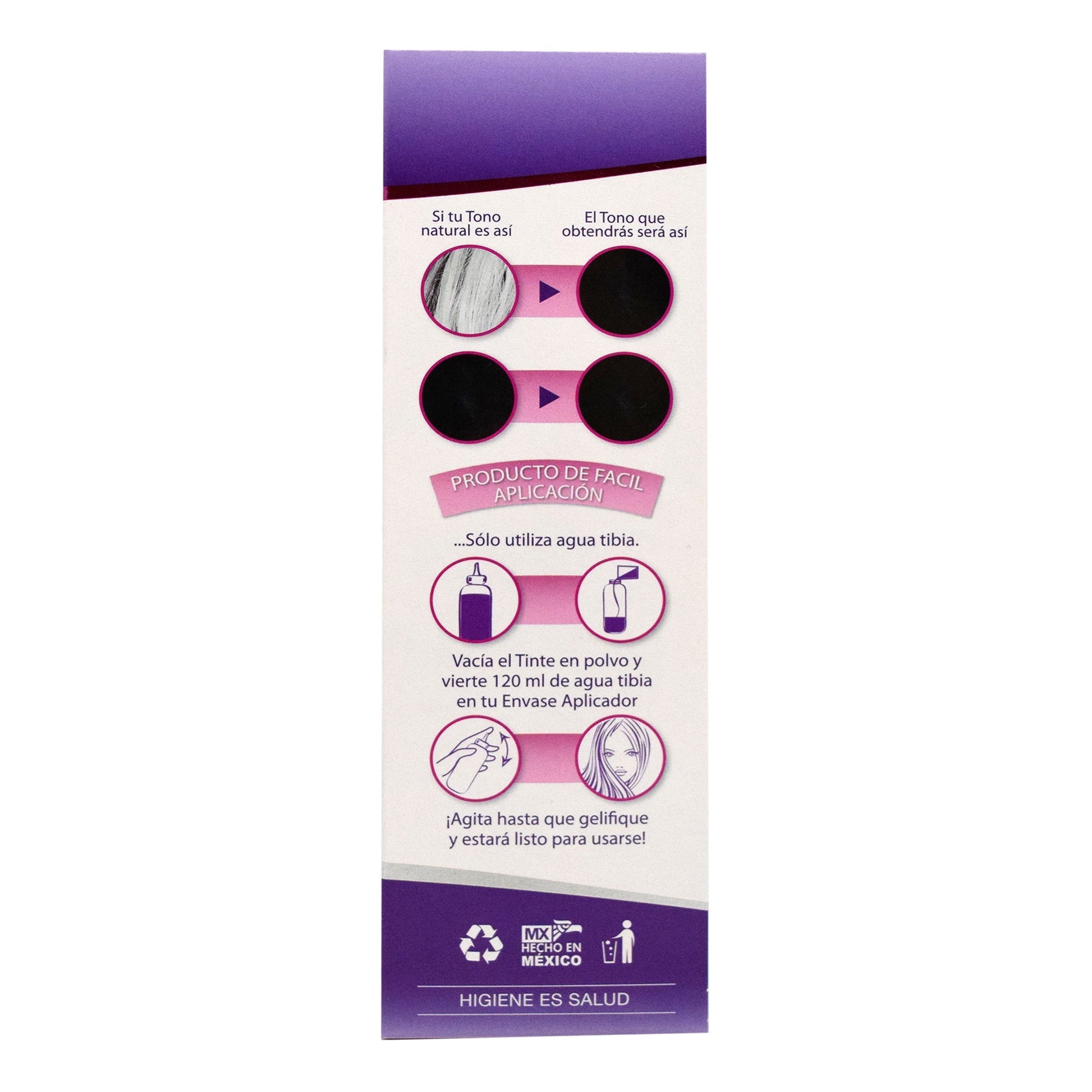 :Colocarse los guantes, verter el polvo en la botella aplicadora, verter 120 ml de agua caliente (50°c) hasta la marca, agitar hasta que esté completamente mezclado, comienza la aplicación y deja actuar desde 30 hasta 45 minutos dependiendo la intensidad del tono que quieras, enjuaga y aplica el revitalizador para cabello por un lapso de 3 minutos, enjuaga nuevamente con agua tibia y seca, desecha el sobrante