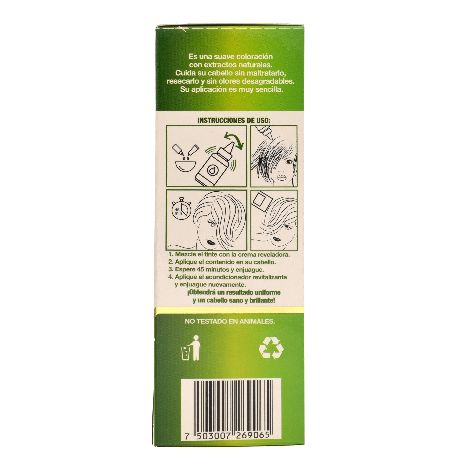 :Mezcle el tinte con la crema reveladora, aplique el contenido en su cabello, espere 45 minutos y enjuague, aplique el acondicionador revitalizante y enjuague nuevamente