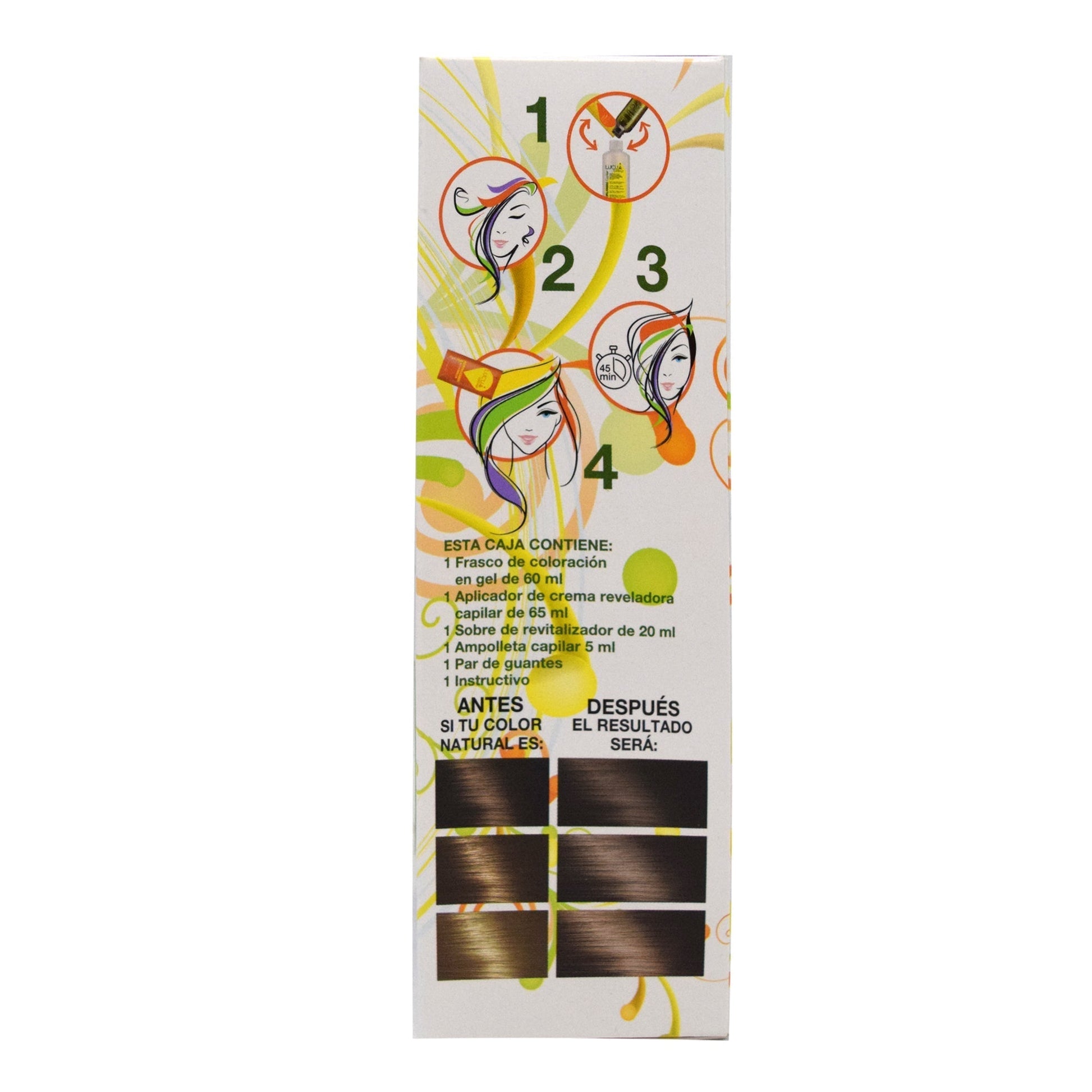 :Utilice guantes desechables para su aplicación, mezcle en el frasco aplicador la crema reveladora la coloración capilar y la ampolleta de aceites naturales hasta obtener una mezcla homogénea, corte inmediatamente la punta del tapón aplicador y proceda con la aplicación desde la raíz deje actuar 45 minutos, después del tiempo trascurrido enjuague con abundante agua