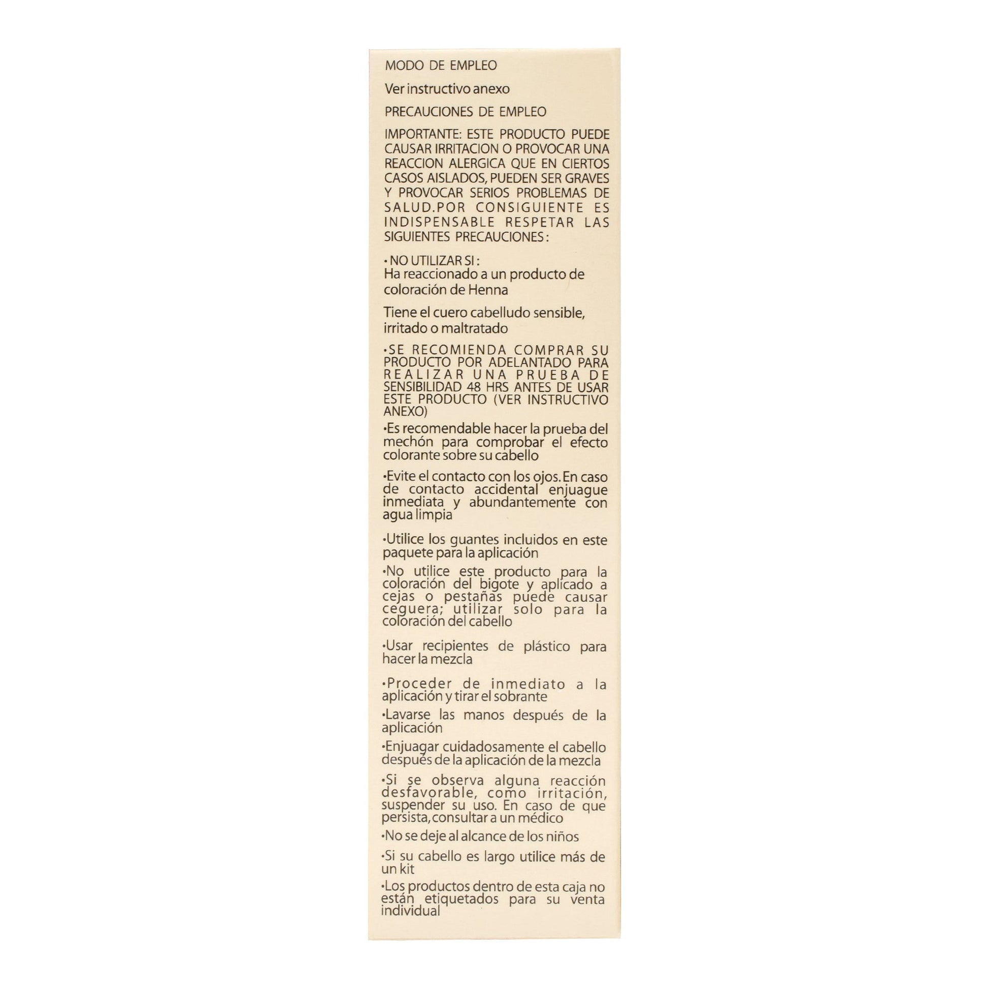 Realizar una prueba de sensibilidad 48 horas antes de su aplicacion de acuerdo con este instructivo, este producto puede causar irritacion en algunas personas, suspenda su empleo en caso de irritacion, evite el contacto con los ojos, en caso de contacto accidental enjuague inmediata y abundantemente con agua limpia, mantener fuera del alcance de los ninos, conservar en lugar fresco y seco