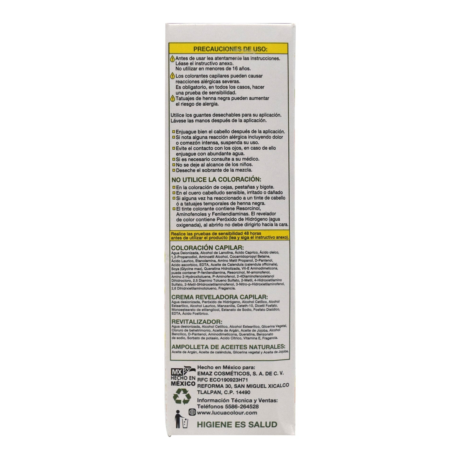 :Utilice guantes desechables para su aplicación, mezcle en el frasco aplicador la crema reveladora la coloración capilar y la ampolleta de aceites naturales hasta obtener una mezcla homogénea, corte inmediatamente la punta del tapón aplicador y proceda con la aplicación desde la raíz deje actuar 45 minutos, después del tiempo trascurrido enjuague con abundante agua