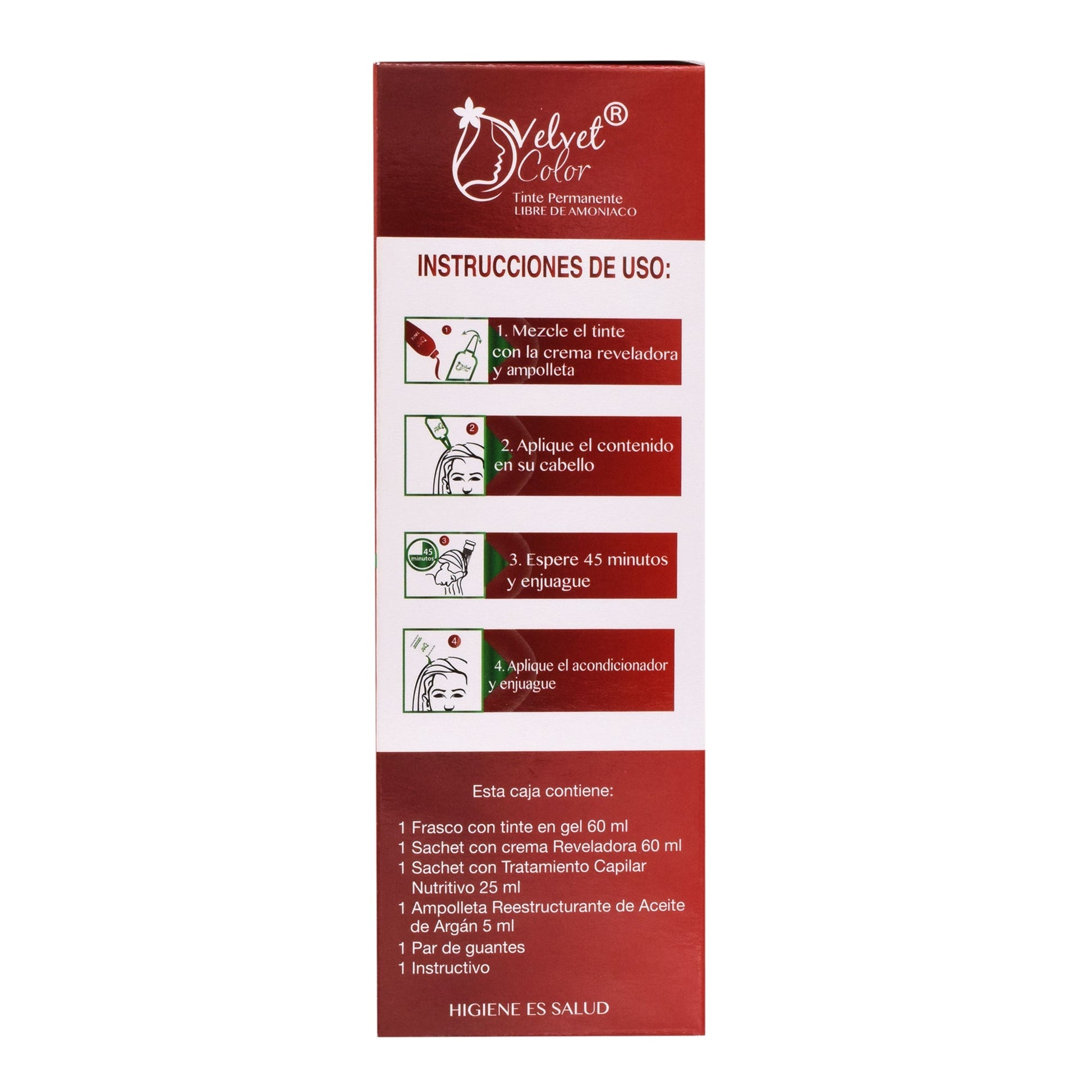 :Mezclar en tinte con la crema reveladora, aplicar el contenido al cabello, esperar 45 minutos y enjuagar, aplicar el acondicionador y enjuagar nuevamente
