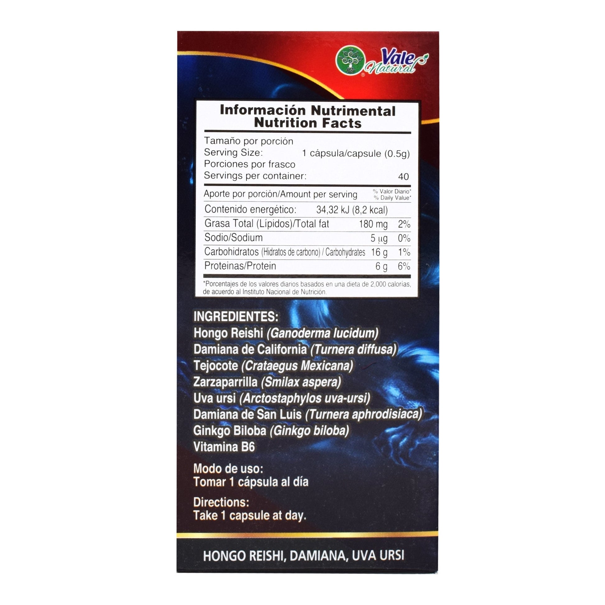 : :Producto hecho a base de hongo seishi, damiana de california, tejocote, zarzaparilla, uva ursi, damiana de san luis, ginkgo biloba, vitamina B, extracto de cafe