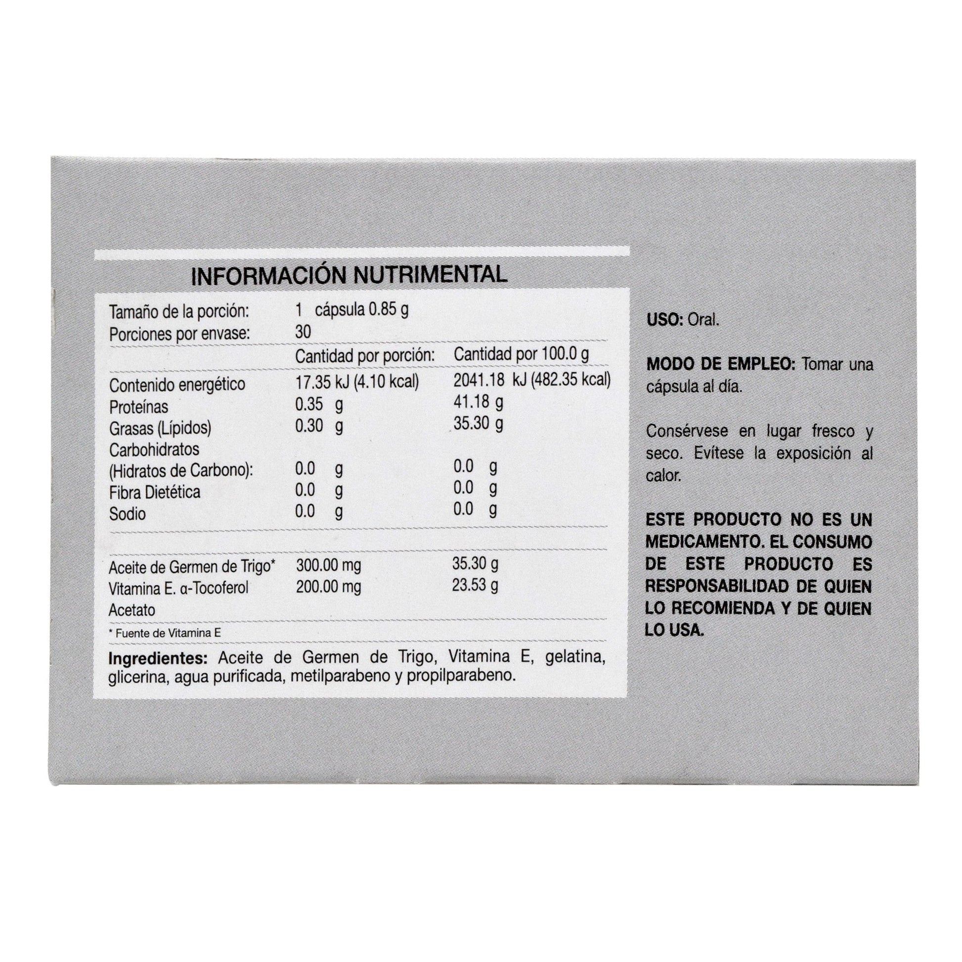 : :Aceite de germen de trigo, vitamina E, gelatina, glicerina, agua purificada, metilparabeno